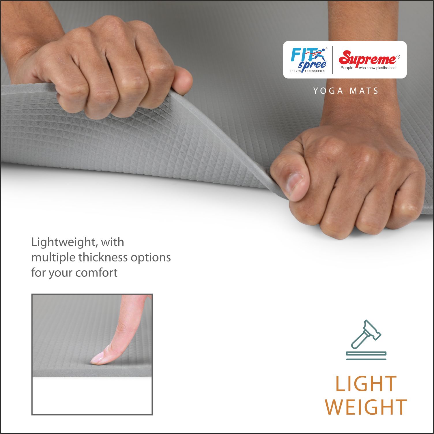 Fitspree offers yoga mats in different colors and thicknesses for various purposes such as 4mm - 6mm yoga mats: Typically used by beginners 7mm yoga mats - regular usage 8mm- 9mm yoga mats - hardcore exercise: Pilates 10mm yoga mats – Used for heavy/stout individuals